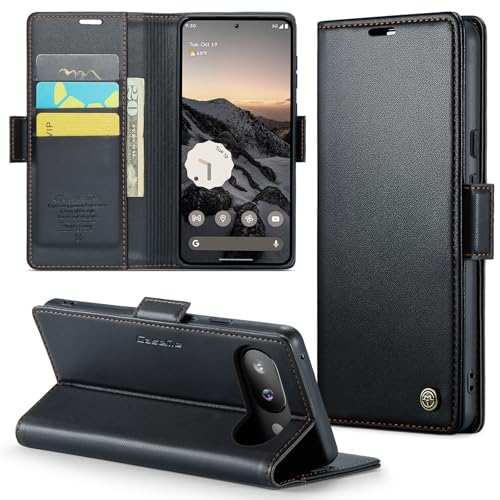 Google Pixel 9a用の手帳型ケース。カードポケット付きで高級レザー製。耐衝撃、全面保護、スタンド機能、ストラップホール、マグネット式閉じ具仕様。カラーはブラック。
