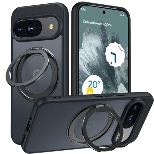 Google Pixel 9/9 Pro対応のMagsafe対応ケース。360°回転スタンド、ワイヤレス充電対応。半透明で指紋防止、黄変防止。ストラップ穴付きのブラックカバー。