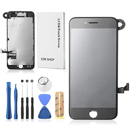 SZM iPhone7用修理交換フロントパネルセット。液晶パネル、タッチパネル、スピーカー、フロントカメラ付き。ホームボタンは含まれていません。カラーはブラック。
