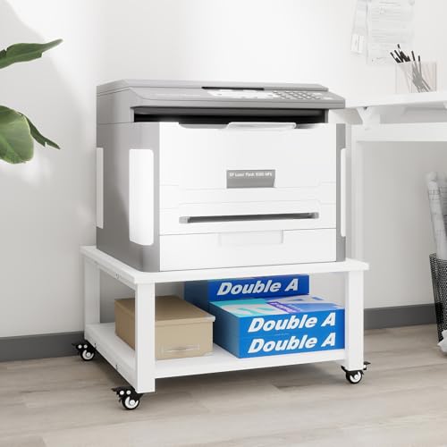 PUNCIA プリンター台は、幅50×奥行50×高さ32cmの木製ワゴンで、キャスター付き。収納棚付きで大型コピー機やレーザープリンタ、FAX機に対応。省スペース設計で75kgの耐荷重があり、簡単組立。オフィスや家庭用の多機能ラックとして最適です。