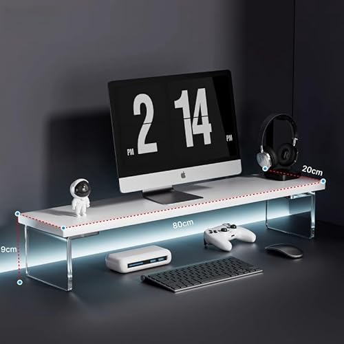 Yobuisgのモニター台は、卓上80cmで高さ調整可能。木製で透明アクリル使用。安定性が高く、省スペース設計。PCやプリンタの設置、キーボード収納にも適したホワイトモデル。サイズは80*20*9cm。