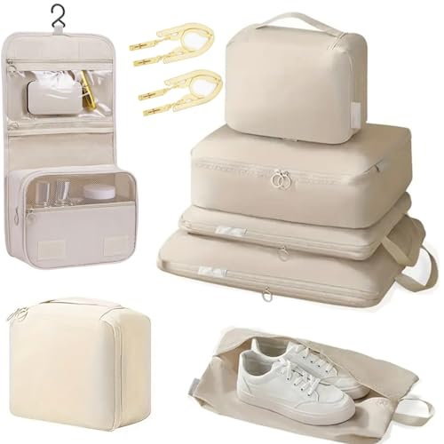 2025年最新型の旅行用圧縮袋10点セット。衣類スペースを約60%節約できる圧縮ポーチや洗面用具入れなどが含まれており、出張や旅行に便利なグレーの収納アイテム。