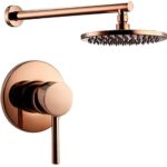 ローズゴールドのバスルームシャワーセット。ソリッドブラス製のダイバーターバルブと8~12インチのラウンドシャワーヘッドを搭載し、ラグジュアリーな体験を提供します。