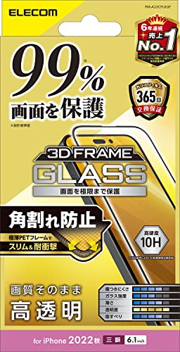 エレコム iPhone 14 Pro用の強化ガラスフィルム。液晶カバー率99%、表面硬度10H、角割れ防止、指紋防止、エアーレス仕様。透明で高光沢、飛散防止フレーム付き。PM-A22CFLKGF.