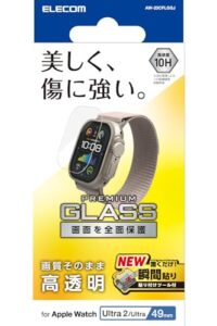 エレコムのiPhone 16 Pro用強化ガラスフィルム。硬度10H、薄さ0.21mmで気泡が入りにくく、指紋がつきません。ガイド枠付きで簡単に貼付可能。