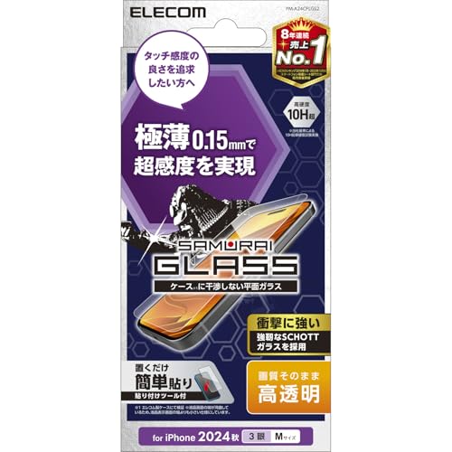 エレコムのiPhone 16 Pro用ガラスフィルムは、強化ガラスで硬度10Hを誇ります。極薄0.15mmで傷に強く、指紋がつきにくい SAMURAIガラスを採用。気泡が入らないガイド枠付きです。