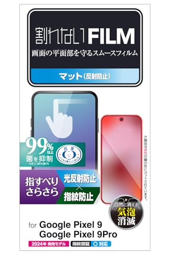 エレコムのGoogle Pixel 9/9 Pro用フィルムは、マットアンチグレア仕様で、抗菌・指紋防止・反射防止機能を備えています。気泡防止と画面内指紋認証に対応し、指すべりがさらさらです。