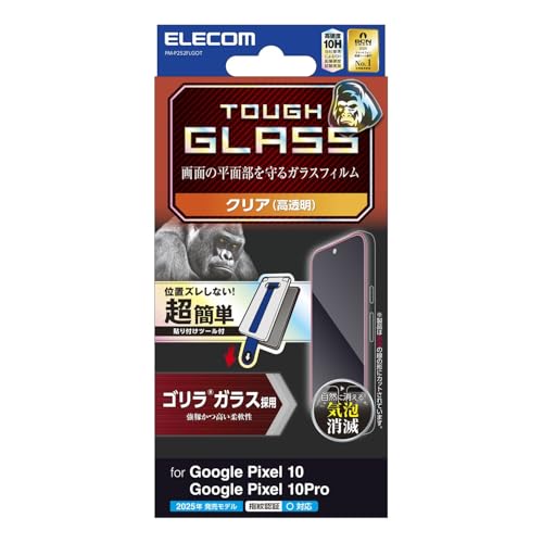 エレコムのGoogle Pixel 10/10 Pro用ガラスフィルムです。硬度10Hのゴリラガラス製で、指紋防止機能付き。厚さ0.21mmで気泡ゼロ、飛散防止設計。貼り直し可能な自己吸着タイプで、簡単に取り付け可能なツール付き。