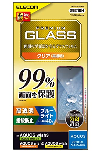 エレコムのAQUOS wish3/S2/S(SHシリーズ)用ガラスフィルム。液晶カバー率99%、硬度10H、ブルーライトカット、指紋防止機能搭載。エアーレス設計でクリアな視界を実現。
