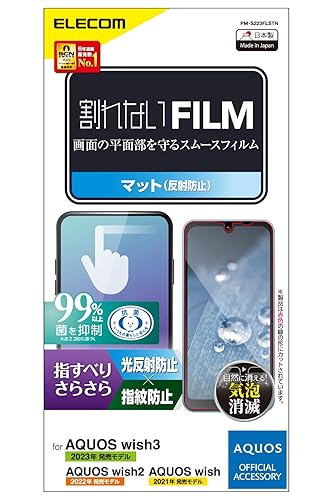 エレコムのAQUOS wish3/2とwish用フィルム。スムースでさらさらな触り心地のアンチグレア仕様。反射防止、指紋防止機能付きで、エアーレス設計。PM-S223FLSTNクリアモデル。