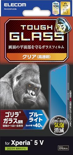 エレコム Xperia 5 V SO-53D SOG12向けのガラスフィルム。ゴリラガラス製、厚さ0.21mm、ブルーライトカット、硬度10H、ラウンドエッジ加工。指紋防止、エアーレス設計でクリアな視界を提供。