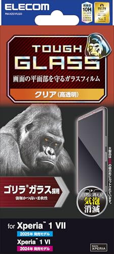 エレコムのXperia 1 VII/Xperia 1 VI用ガラスフィルム。ゴリラガラス製で硬度10H、厚さ0.21mm。指紋防止機能搭載、気泡レス設計でクリアな視界を提供。