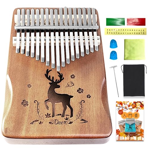カリンバ初心者セット。17キーのマホガニー製、チューニング済み。入門書と日本語楽譜付きで、初心者に最適。焦茶色の刻印あり。