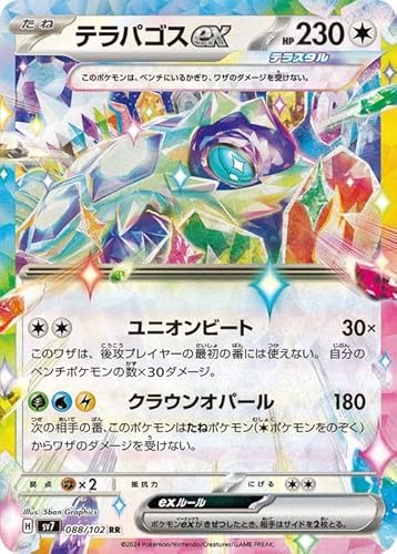 ポケモンカード SV7 拡張パック ステラミラクルのテラパゴスex RR (088/102)は、無色のたねポケモン。特別な能力と高いHPを持ち、戦略的に使える魅力的なカードです。
