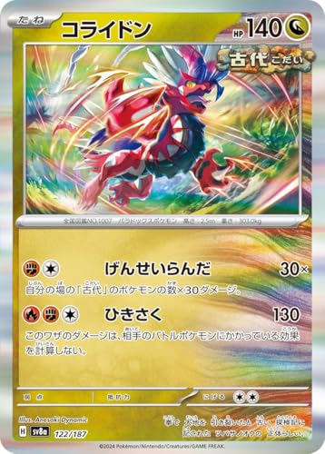 ポケモンカードゲームSV8aのハイクラスパック「テラスタルフェスex」に収録されたコライドン(122/187)は、ドラゴンタイプのたねポケモンです。特別な能力や技を持ち、戦略的なプレイが可能です。