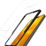 エレコムのiPhone 16e/14/13/13 Pro用強化ガラスフィルム。硬度10H、指紋防止、自分で貼りやすいエアーレス設計。飛散防止機能付きで、2枚入り、ガイド枠付き。