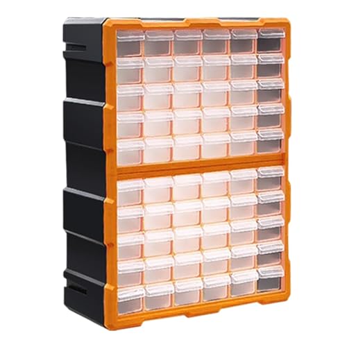 小さなパーツ収納グリッドキャビネットは、60個の引き出しを備え、積み重ねが可能。ガレージやクラフトの整理に最適です。