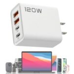 高速充電対応の120Wプラグアダプター。Type-CおよびUSBポートで携帯電話、タブレット、PCを充電可能。旅行にも最適。