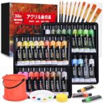 50点セットのアクリル絵の具36色に加え、ブラシ10本、パレット、折り畳みバケツ、スポンジ、キャンバスが付属。速乾性・防水性を備え、木、卵、陶器、布に描ける初心者向けの美術セット。