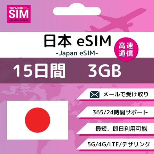 日本の15日間プランのeSIM(3GB)です。高速通信で、契約不要、残量確認が可能。期限なしで追加購入も可能。多言語サポート付きで使いやすい、使い捨てSIMです。