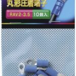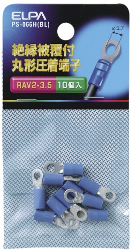エルパの絶縁丸端子2-3.5は、絶縁被覆付きの圧着端子で、サイズは18.6mm、より線の適合範囲は1.04~2.63㎟です。10個入りのブルー(PS-066H(BL))です。
