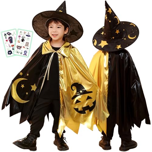 GOKEIのハロウィン子供コスプレは、マントと帽子付きで、魔女や魔法使いの衣装。タトゥーシール2枚付きで、パーティーやイベントに最適。キラキラのポンチョととんがり帽子が演出を引き立てる、男の子・女の子用コスチュームです。