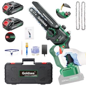 電動チェーンソー,手軽なコンパクトなハンディノコギリ 小型 軽量、女性にもおすすめです,ブラシレスチェーンソー,Goldsea製の充電式枝切りミニソーは、庭木の剪定や太い生木の切断に,自動給油装置付き、工具組み立て不要の、2つのバッテリ21 v 2.0 Ah大容量バッテリ、6インチ (グリーン F01)
