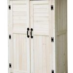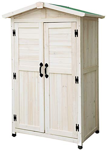 ガーデンガーデンの三角屋根木製収納庫ポタジェ。サイズは幅106cm、高さ160cm、奥行69cm。ウォッシュホワイトカラーで、ガーデンシェッドとして収納や装飾に最適です。
