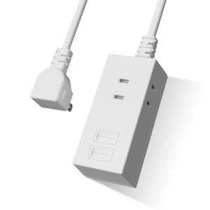 STYLED USB付き電源タップは、合計4.8A出力の2ポートUSBと4つのACコンセントを備え、急速充電が可能。個別スイッチで便利、雷ガード付きで安心。保証18ヶ月、長さ2mのコード。
