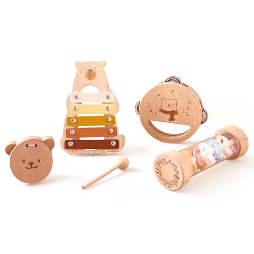 木製の音楽おもちゃ4点セット。木琴、カスタネット、タンバリン、レインボーメーカーが含まれ、幼児の音楽啓蒙や知育に最適です。1歳や2歳の誕生日、出産祝いにもおすすめ。