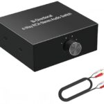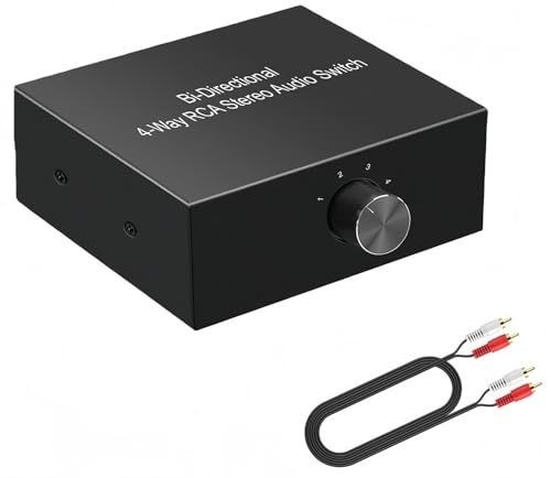 4入力1出力または1入力4出力の双方向RCAステレオ音声スイッチャー。CDプレーヤーやDVDスピーカーに対応。電源不要で手軽に音声切替が可能。