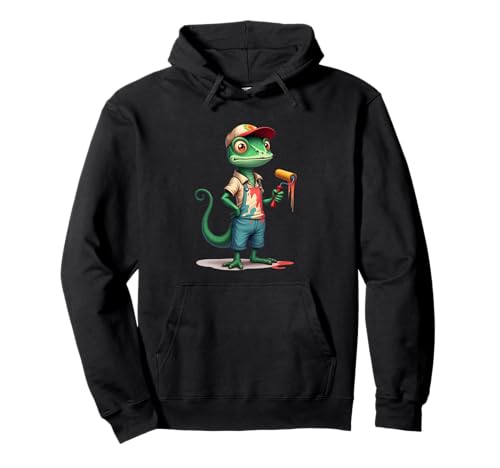 ペイントローラーを持つカートゥーン風カメレオンのイラストが施されたパーカー。ユニークなデザインで、個性を引き立ててくれるアイテムです。おしゃれで温かい素材を使用しており、カジュアルなスタイルにぴったり!