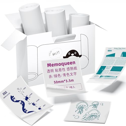サーマルロール紙の感熱紙で、専用のMemoqueen T02およびPhomemo/Memokingミニプリンターに対応。50mm幅・3.5mのノーカットラベルシール3巻セット。透明地にレッド/グリーン/ブルー文字、強粘着・防水で長期保存に適しています。手帳やオフィス、DIYラベルに最適!