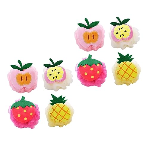 healvianの8個カラフルフルーツ形状バスボールは、肌に優しい素材を使用した泡立てメッシュで、男女兼用の角質ケアに最適なボディクレンジング製品です。リラックスしたバスタイムを楽しめます。