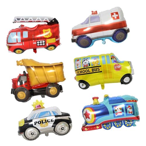 男の子の誕生日にぴったりな乗り物テーマのバルーン飾りセット。救急車、パトカー、消防車、バス、蒸気車、働くくるまの巨大バルーン6体入り。楽しいバースデーパーティーを演出します!