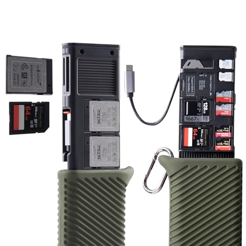 PGYTECHのCFexpress Type B/SD/Micro SDカードリーダーは、USB 3.2 Gen 2 (10Gbps)対応で、Windows/Mac/Linux/Android/iPad OSに対応。モスグリーンのデザインです。