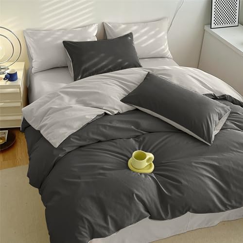 DPEANの布団カバーセットは、洗いざらしのシワ加工が特徴で、肌に優しくやわらか。洋式・和式兼用で、ダークグレーとライトグレーのシンプルなデザイン。吸水速乾、丸洗いOKのダブル・4点セット。オールシーズン対応。