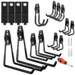 ガレージフック 17個セット。強力L型ダブルフックで、自転車や工具を壁掛け収納。マジックテープ付きでDIYが簡単。ネジ付属、使用例:はしご、ホース、倉庫整理に最適(ブラック)。