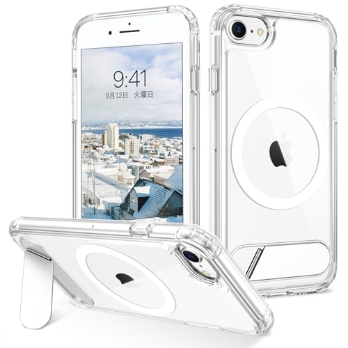 DOMAVER iPhone SE 第3世代、第2世代、iPhone 8、7対応の透明ケース。MagSafe対応、スタンド付き、軽量で耐衝撃。PC+TPU素材で画面とレンズを保護。