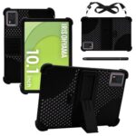 アイリスオーヤマのLUCA TA10E1W63-V1Hケースは、シリコン素材で耐衝撃性と防水、デザイン性に優れたブラックのタブレットカバーです。スタンド機能やペンスロット、ショルダーストラップ付き。