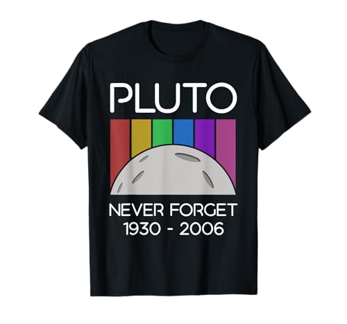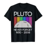 「冥王星は決して忘れない」Tシャツ。ユニークなデザインが宇宙愛好家に人気。高品質素材使用で快適な着心地。天文学や銀河への愛を表現する一枚です。