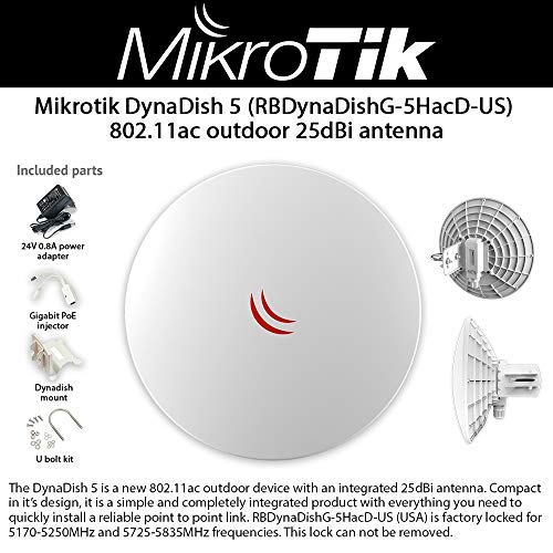 Mikrotik DynaDish 5は、5GHz対応の802.11acアウトドアデバイスです。25dBiのネットワークアンテナを搭載し、720MHz CPUを備えています。US版。