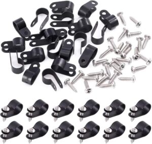 Rタイプ ケーブルクランプ 100個入り ケーブルクリップワイヤークランプ R型 コードクリップ ネジ付き (黒, 直径10.4mm)