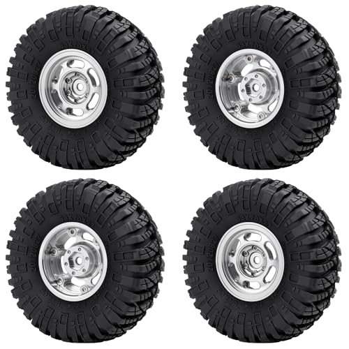 RCMAZO 4PCS 1.3インチビードロックホイールとタイヤセット。1/18、1/24スケールのSCX24、TRX4M向け。アルミホイール、70*27mm柔らかいゴムクローラー、シルバー色。