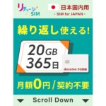 リチャージSIMは、20GBのデータを365日利用可能な物理SIMカードです。契約不要で月額0円、ギガリチャージで再利用が可能。4G LTE/5G対応、NTTドコモ回線を利用した格安のプリペイドSIMです。