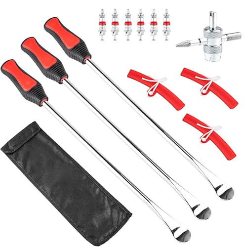 タイヤレバー全長37.5cm、3本セット。メッキ加工で耐久性抜群。バイクや自転車のタイヤ交換に最適な脱着専用工具。収納袋付きで持ち運び便利な13点セット。