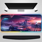 ピンクのレトロウェーブデザインのRGBラージゲーミングマウスパッド。アニメビューティーをテーマにした500x1000mmサイズ。ノンスリップベースで安定性抜群。LEDライティングでカスタマイズ可能。