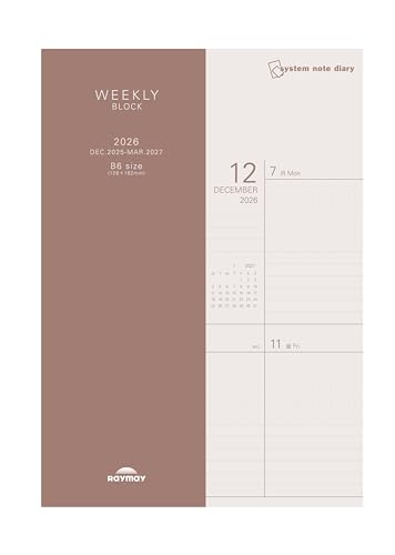 レイメイ藤井の2026年スケジュール帳、システムノートダイアリーはウィークリー・ブロック形式のB6サイズ。2025年12月始まりで、計画的な日々をサポートします。