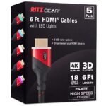 Ritz Gearの6フィートHDMIケーブル5本パック。マルチカラーLEDライト付き。PS5、PS4、Xbox Series X、ゲーミングPC、4Kプロジェクター対応。