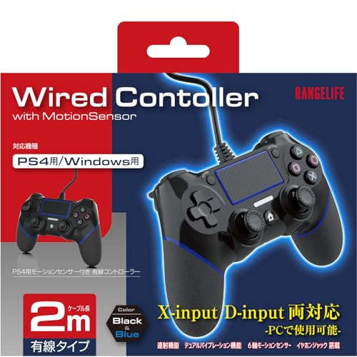 PS4コントローラーは、有線接続でPC対応。モーションセンサー、6軸センサー搭載、連射機能や振動機能、ヘッドセット端子付き。ケーブル長は2m、ブラック&ブルーのデザインです。